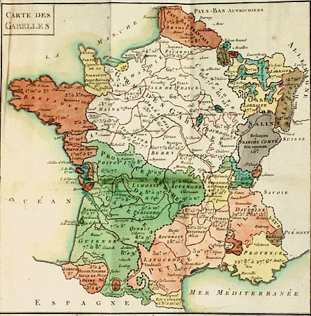 | Carte des six gabelles publiée dans "Compte rendu au Roi [...] janvier 1781", Bibliothèque National de France. |
